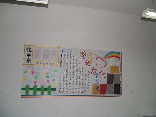 为响应公司学风建设活动,我系将“班级文化墙”作为学风建设的一项重要内容。 自11月份以来,我系各班教室的墙壁上陆续多了一道道靓丽的风景线,那就是各班经过精心设计的反映班级整体风貌的文化墙。各班的文化墙设计独树一帜,内容新颖,风格多异,各班同学积极参与,大家各显其能。