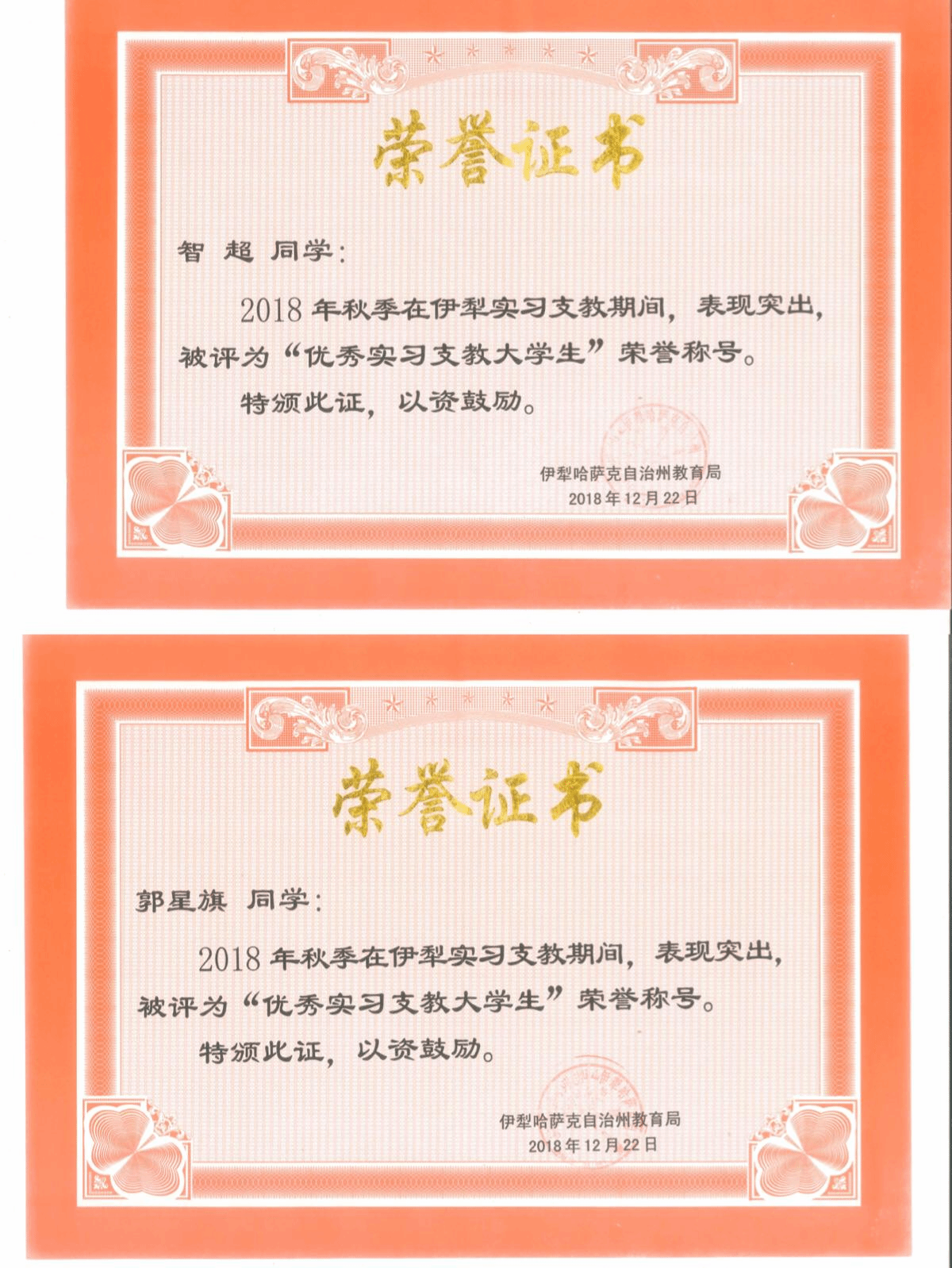 12月22日,伊犁哈萨克自治区教育局在巩留张家港实验公司召开了2018年秋季顶岗实习支教总结表彰大会,公司化学1501班郭星旗、循环1501班智超被授予“优秀实习支教老员工”荣誉称号,受到伊犁州教育局表彰。