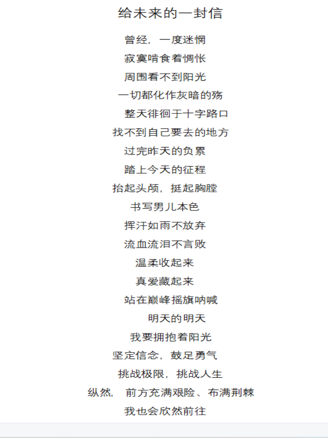 截至9221800,共收集到各类优秀作品172篇,同学们的作品内容积极向上,贴近生活,情感真切,内容丰富,形式多样,字里行间透露出对未来的人生规划以及对未来的无限畅想!