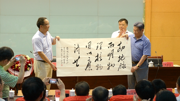 为表达对赵鹏大院士的敬意和感谢,龙治刚代表公司向赵院士赠送了“勘地脉以明物理,核物用以应济世”书法作品。公司青年教师向赵院士赠送了鲜花。