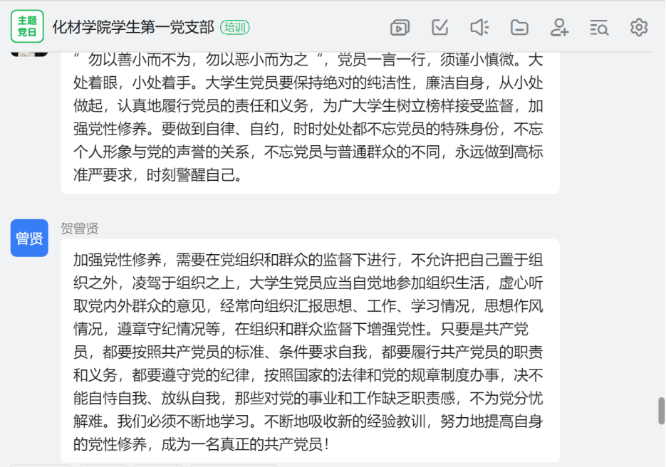 为提升学党员的纪律意识,增强员工党员的党性修养,2022年9月21日下午15:30,suncitygroup太阳集团员工第一党支部书记王嘉琳以《做合格党员须着眼‘小’处》为主题在钉钉平台为本支部全体党员讲纪律教育专题党课。本支部党员及预备党员共33人参与了本次专题党课学习。
