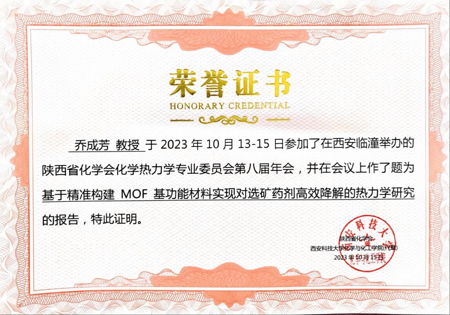公司副经理乔成芳教授作了题为“基于精准构建 MOF 基功能材料实现对选矿药剂高效降解的热力学研究”的大会报告,分享了“MOF基功能材料热化学”团队在尾矿库区废水中金属离子的检测、选矿药剂的高效降解的相关工作,并与参会专家进行交流。