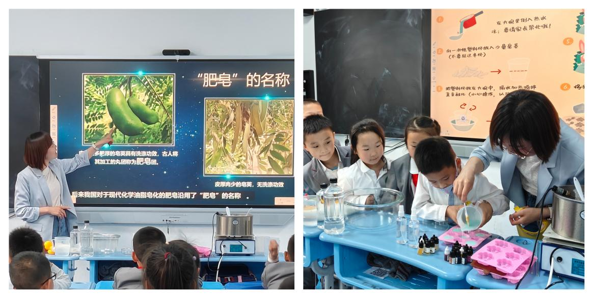 活动在手工皂制备实验中拉开序幕。徐珊老师以"肥皂从哪里来"引发孩子们的好奇心,深入浅出讲解皂化反应原理后,指导大家动手制作卡通肥皂。溶解、混合、成型,当草莓味的粉色小熊皂、薄荷味的蓝色星星皂逐渐成型,孩子们举着作品说:"原来洗手皂里藏着化学魔法!"