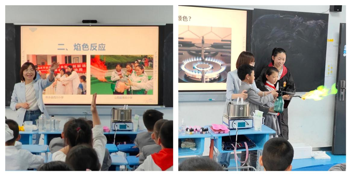 随后的焰色反应实验化作"课堂烟花秀"。团队成员用蘸有氯化钠、硫酸铜等溶液的棉棒点燃,火焰瞬间绽放出明黄、靛蓝、绛红等斑斓色彩。"为什么不同颜色的火焰代表不同金属?"面对孩子们的踊跃提问,马梓萌同学举着元素周期表卡片耐心解释,让抽象的化学元素在跳动的火光中变得鲜活。