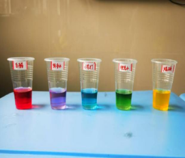 紫甘蓝汁遇到酸性液体时会变红,在弱碱溶液中呈现蓝色或绿色,强碱溶液中显现黄色,利用这一现象可以制作紫甘蓝酸碱指示剂来测试溶液的酸碱性。在互动环节,小朋友们积极使用紫甘蓝酸碱指示剂,探索生活中各种液体的酸碱性,开心地观察着生活中的五颜六色。