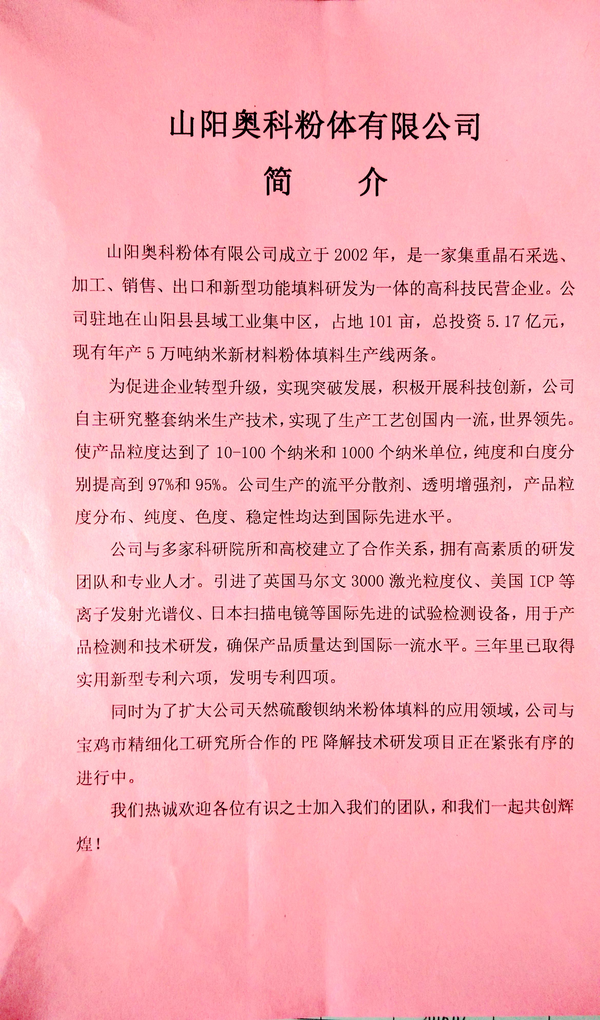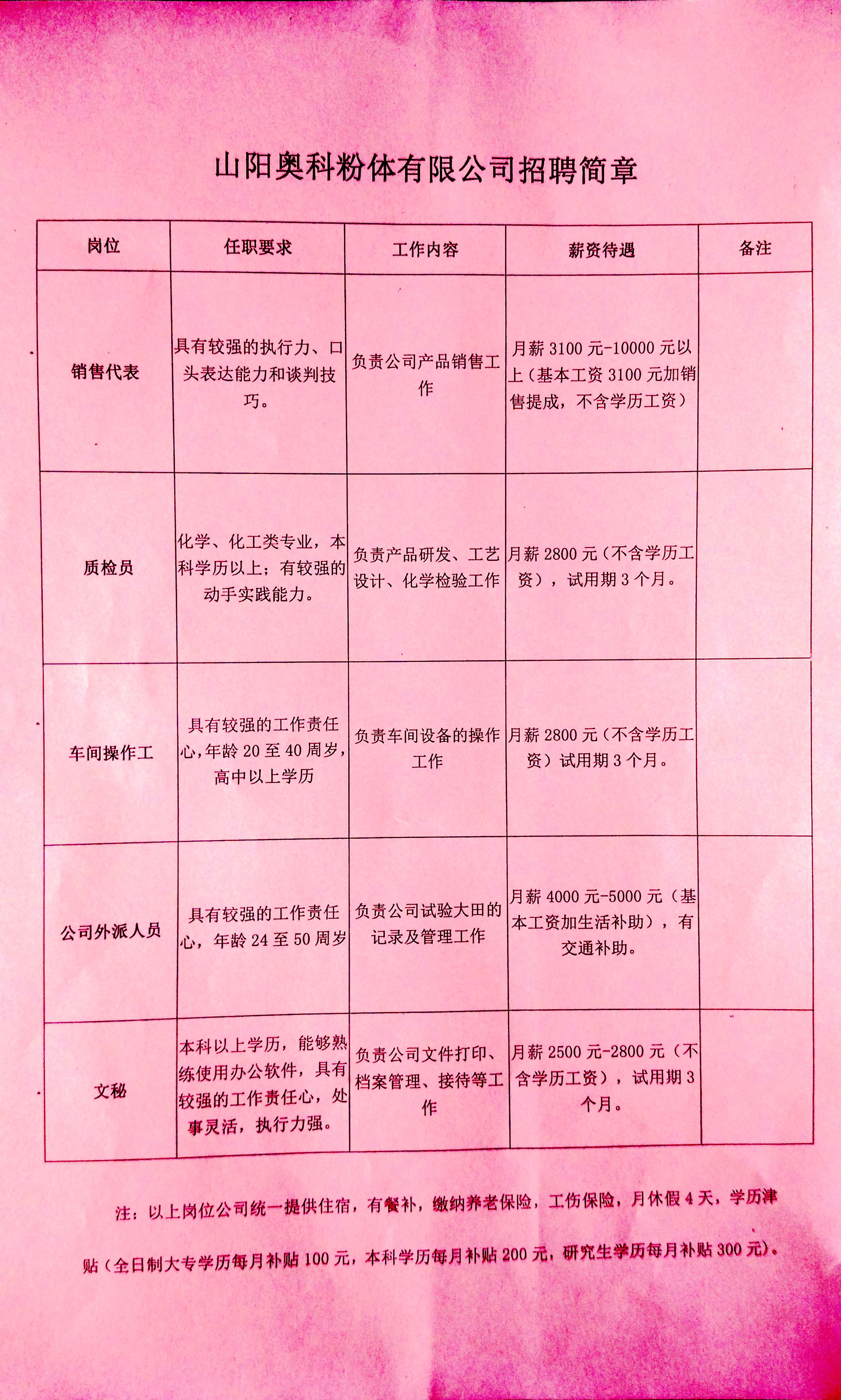 据悉,2017年山阳奥科粉体有限公司计划招聘实习生25名,专业要求:男女不限,化学、应用化学、金属材料工程专业皆符合要求。