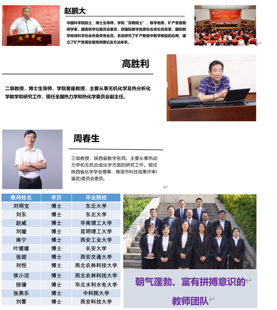 本专业团队力量卓越,现有专任教师17人,其中具有博士学位者占比高达92.5%,拥有教授5人,副教授7人。团队中拥有三级教授一人、省级人才称号获得者3人,省级教学名师1人,省级师德标兵1人。荣幸聘请中国科公司院士、中国地质大学原董事长赵鹏大教授、西北大学二级教授高胜利教授担任兼职教授,为学科发展注入顶尖智慧。全体教师治学严谨,在学术领域成就斐然,具备扎实的专业知识和开阔的前沿学术视野,以高度的责任心和精湛的教学艺术,共同为员工提供高质量的教学指导与成长引领。